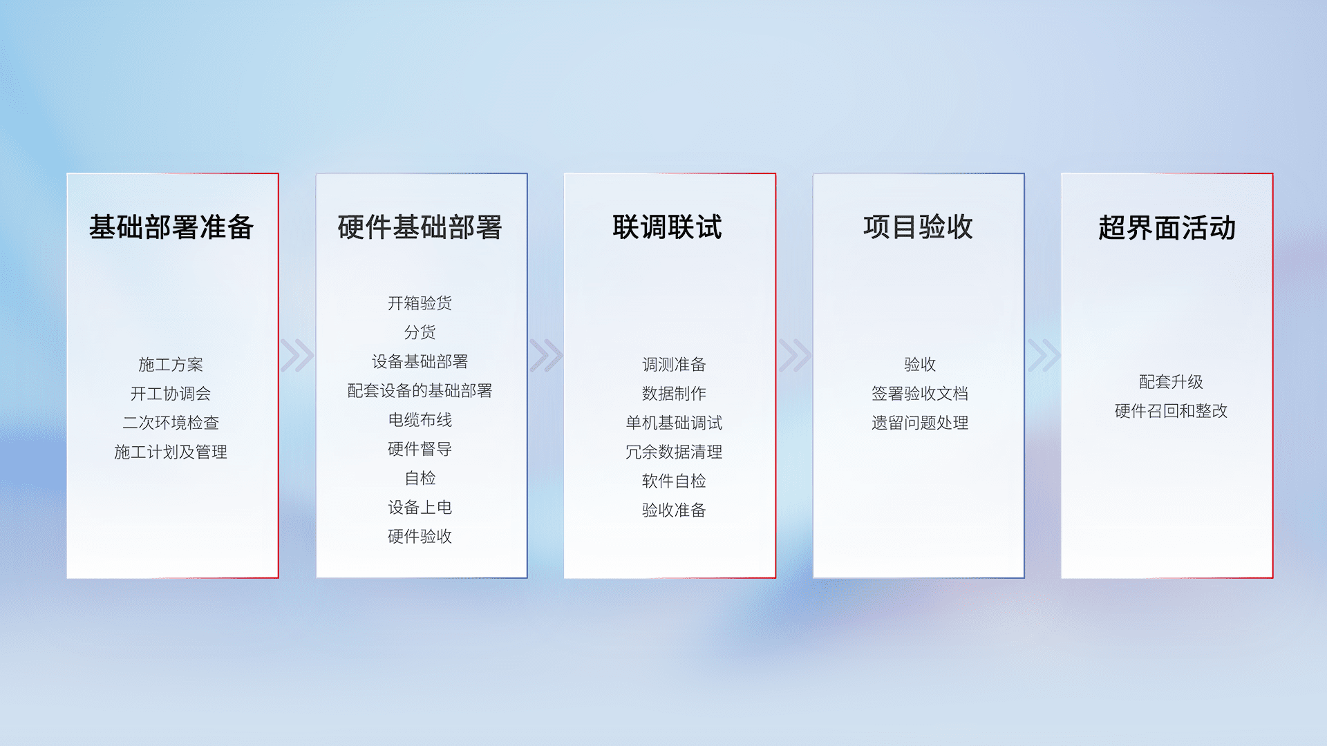 从基础部署准备、、硬件基础部署、、、、联调联试、、项目验收、、、越界面活动的全过程可追溯,,,保证施工质量和进度。。